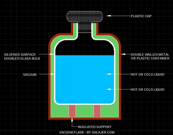 Udara di antara dinding disingkirkan (vakum) untuk menghalang kehilangan haba melalui konduksi atau perolakan.