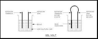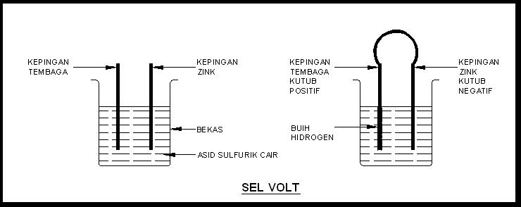 -Seperti yang ditunjukan pada rajah sel  volt terdiri daripada satu bekas yang mengandungi h2so4 cair