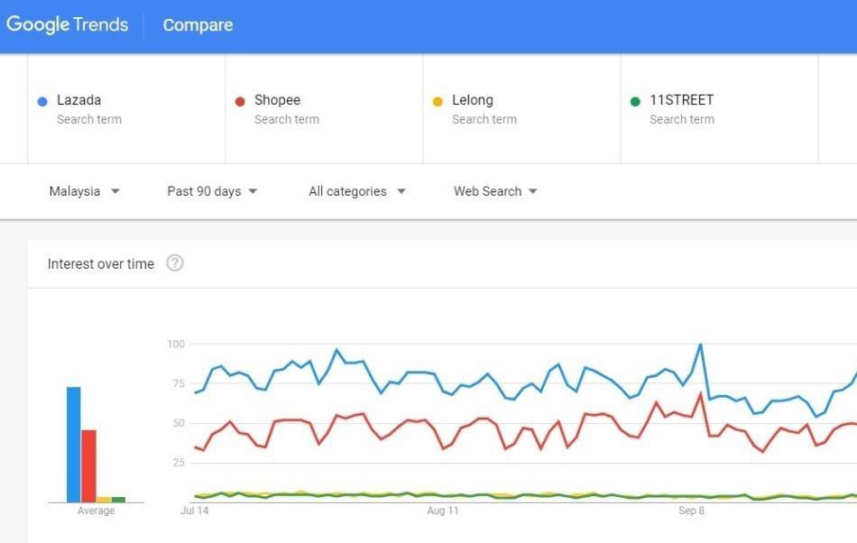 Kita boleh lihat di Google Trend bagaimana Lazada berada di kedudukan nombor 1 berbanding platform yang lain seperti Lelong, Shopee dan 11th Street.