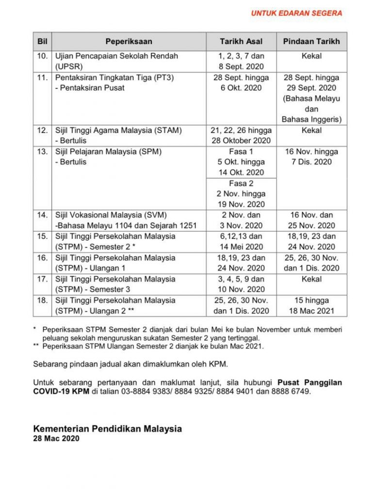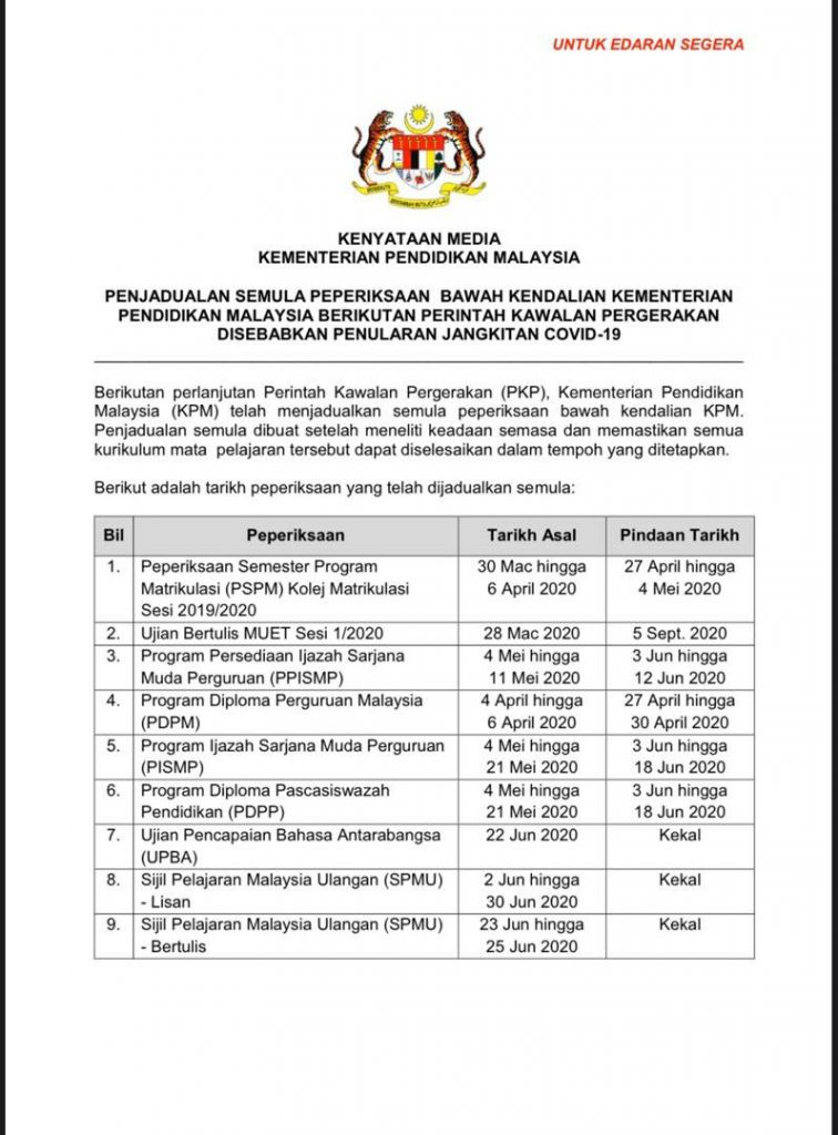 Penjadualan semula peperiksaan dibawah kendalian Kementerian pendidikan Malaysia berikutan perintah kawalan pergerakan disebabkan penularan jangkitan Covid19.