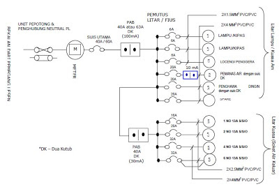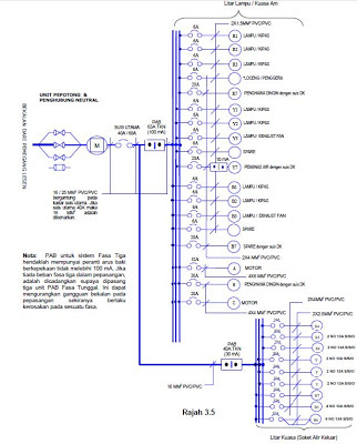 Pendawaian elektrik adalah terdiri dari kelengkapan elektrik seperti kabel, papan suis, suis utama, pemutus litar kenit (MCB) atau fius, pemutus litar arus baki (PAB/RCD), mata lampu, mata kuasa, penangkap kilat dan lainlain lekapan elektrik. Pendawaian elektrik pengguna fasa tunggal Contoh 1 seperti Rajah 3.2