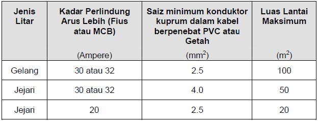 Jumlah litar akhir yang perlu diagihkan dan saiz konduktor yang digunakan serta luas lantai maksimum yang dibenarkan boleh ditentukan dengan berpandukan jadual di bawah.